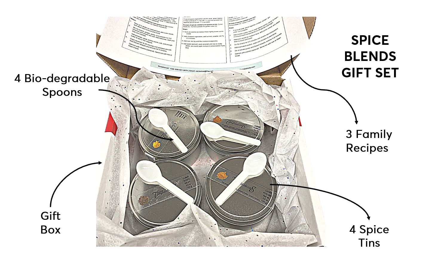 DESCRIPTION: FOUR Gourmet Indian Spices and Blends, bursting with flavor, tightly packed into re-usable tins and 4 bio-degradable spice spoons PLUS 3 traditional Indian recipes to make Chicken Vindaloo, Aloo Mutter and Vegetable Pulao.