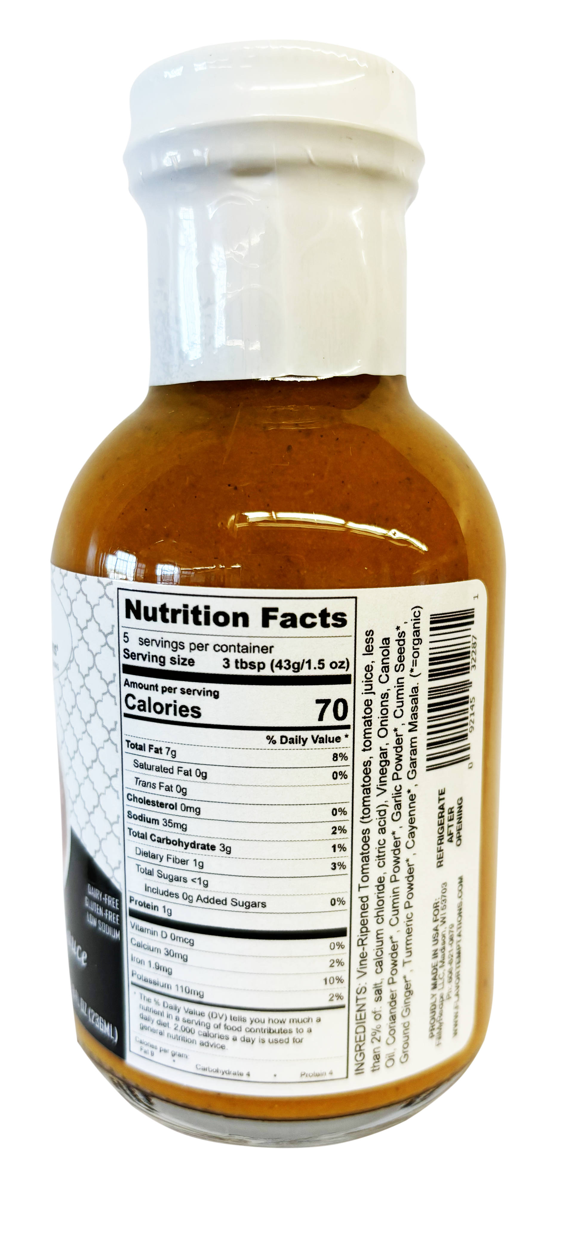 Tomatoes (Tomatoes, Tomato juice, <2% of: salt, citric acid, calcium chloride), Distilled vinegar, onions, canola oil, Organic Coriander powder, Organic Cumin powder, Garlic powder, Organic Cumin seeds, Ground ginger, Organic Turmeric powder, Organic Cayenne pepper, Organic Garam masala (Bay leaf, Cinnamon, Black pepper, Cloves, Cumin seeds, Coriander seeds, Cardamom)