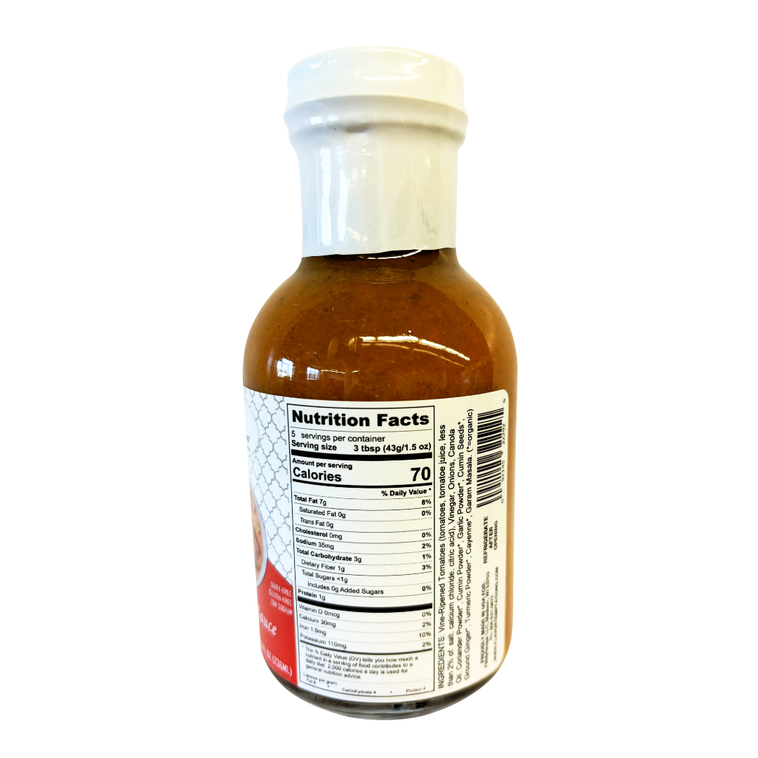 Tomatoes (Tomatoes, Tomato juice, <2% of: salt, citric acid, calcium chloride), Distilled vinegar, onions, canola oil, Organic Coriander powder, Organic Cumin powder, Garlic powder, Organic Cumin seeds, Ground ginger, Organic Turmeric powder, Organic Cayenne pepper, Organic Garam masala (Bay leaf, Cinnamon, Black pepper, Cloves, Cumin seeds, Coriander seeds, Cardamom)