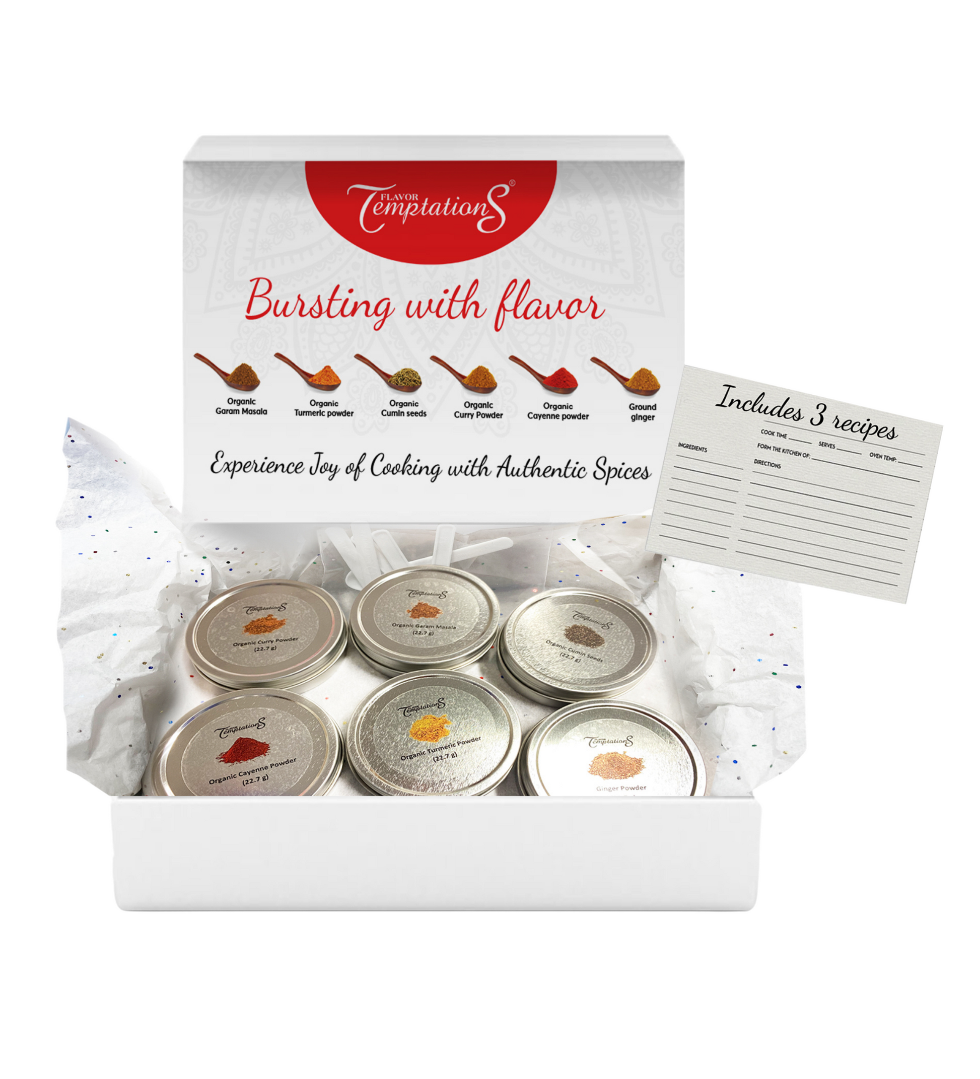 Indulge in the rich flavors of Indian cuisine with Six Gourmet Indian Spices & Seasonings packed in reusable tins. This set includes Organic Turmeric, Cumin Seeds, Curry Powder, Cayenne Powder, Ground Ginger, and Organic Garam Masala — perfect for creating authentic dishes like Chicken Vindaloo, Aloo Mutter, and Vegetable Pulao.