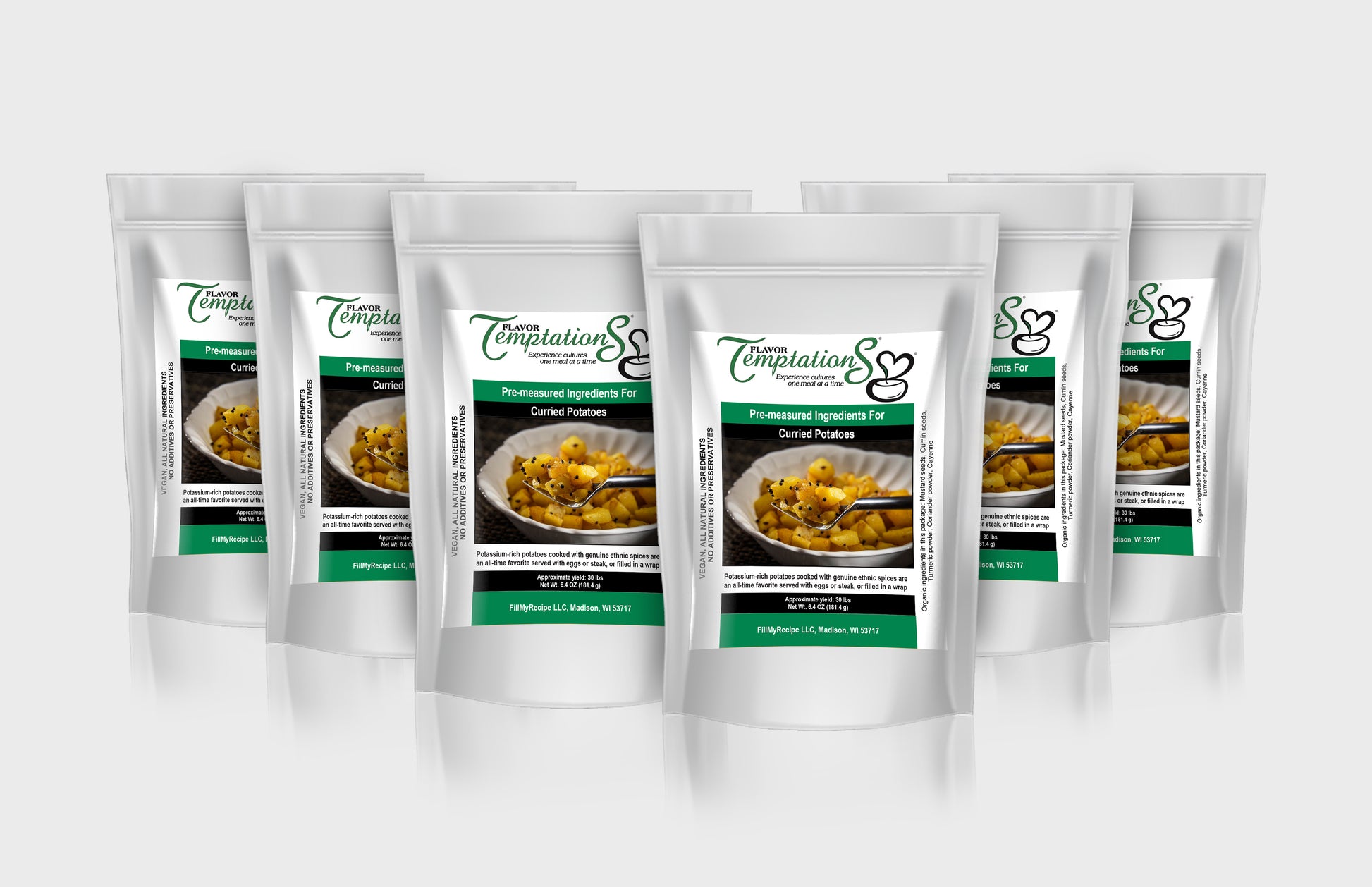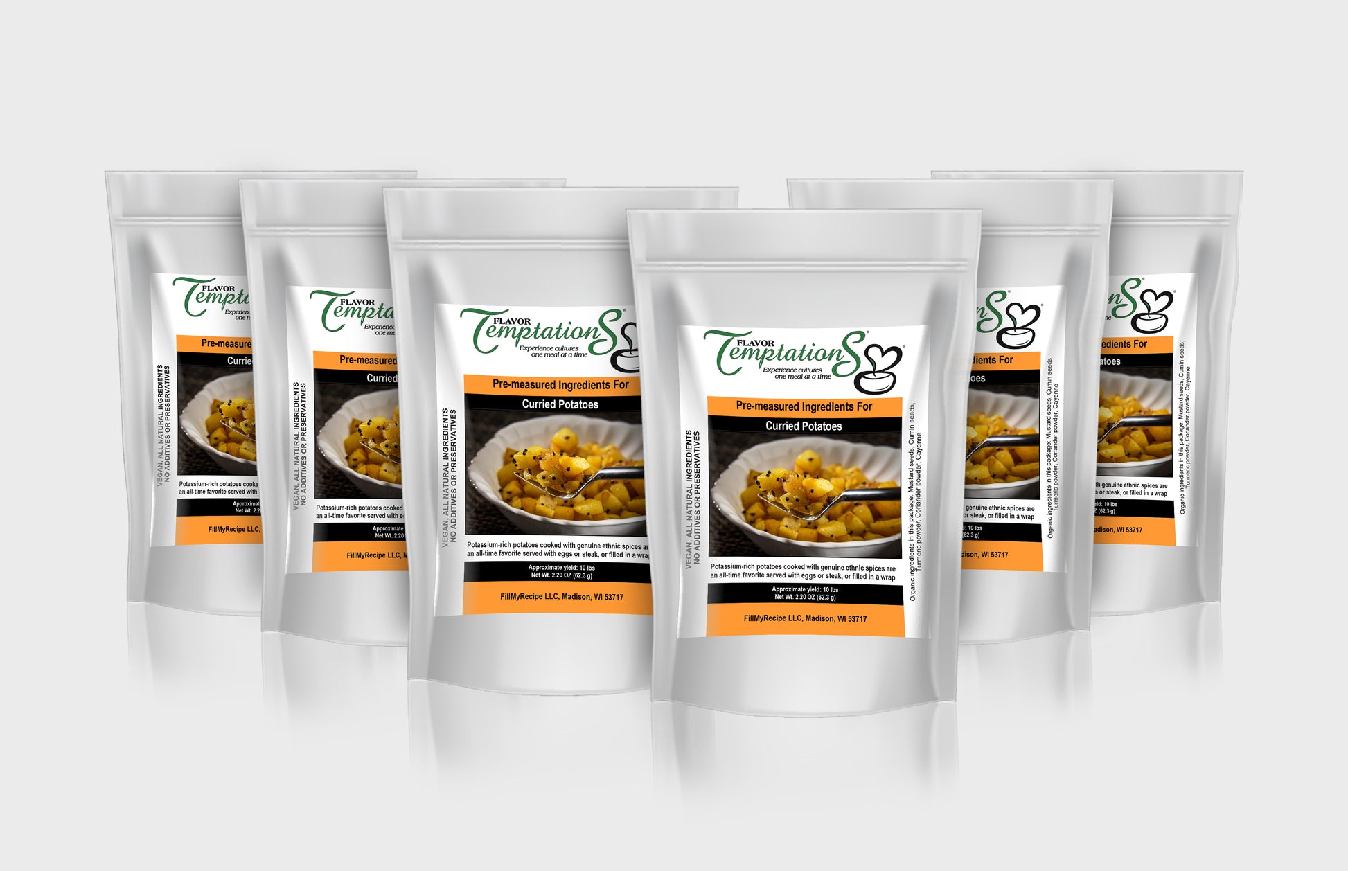 Large (green label): each pack makes 30LBs of Potato Curry for 150 servings