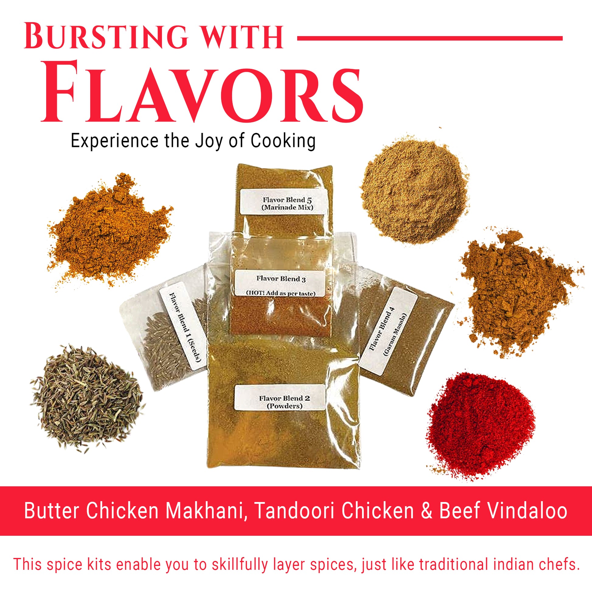 The secret to authentic Indian cooking is the layering of spices. Some spices need to be toasted in oil, some added to the protein, and some added as garnish. Individually packing the spices allows you to truly experience the aromas of each spice blend as it is added