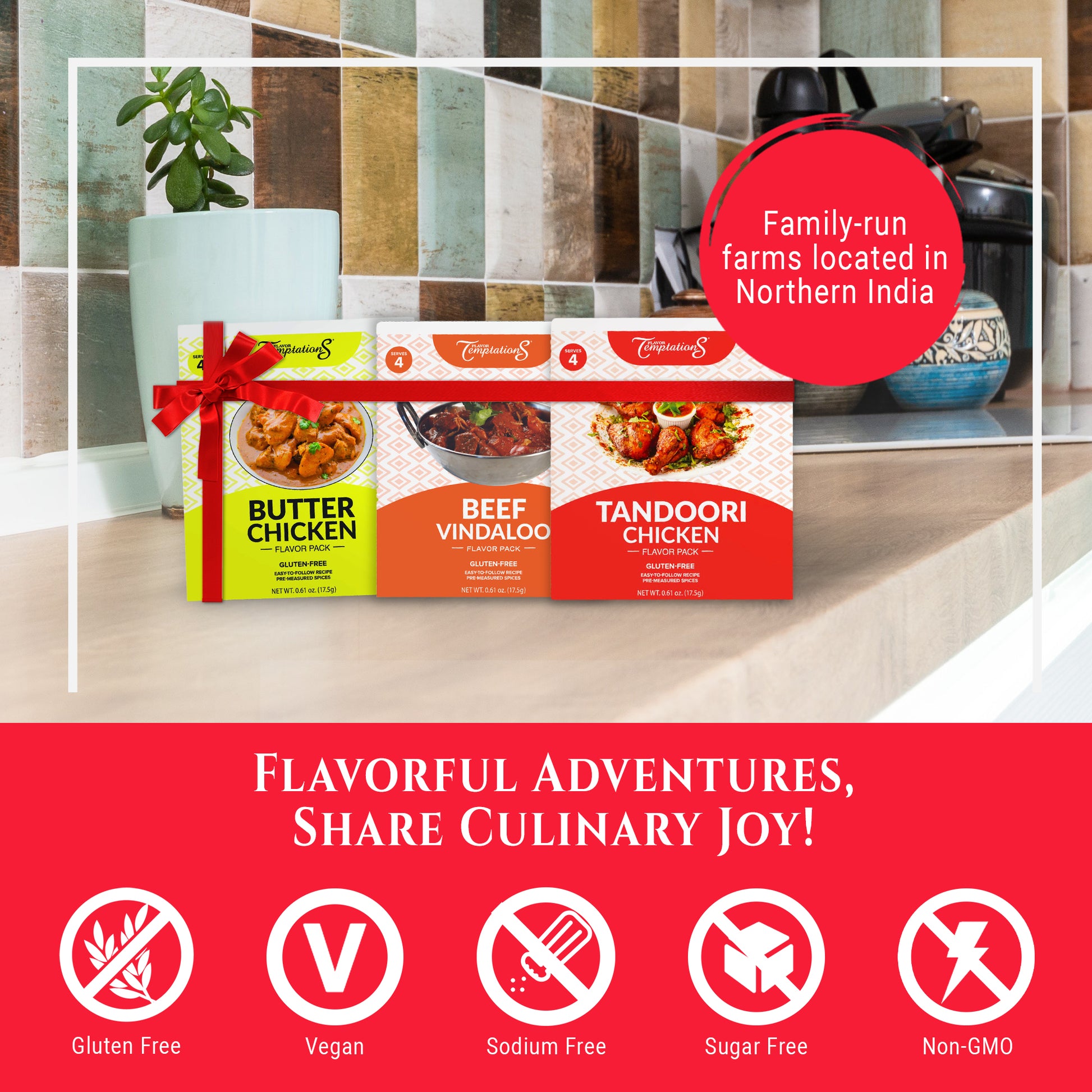 Enhance your cooking with this gluten-free, salt-free Indian spice kit to make Butter Chicken, Tandoori Chicken, and Beef Vindaloo curries. Perfectly paired with Basmati rice or naan bread, this spice kit offers easy-to-follow recipes.