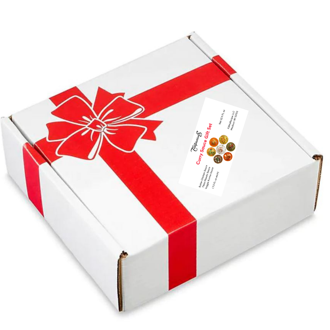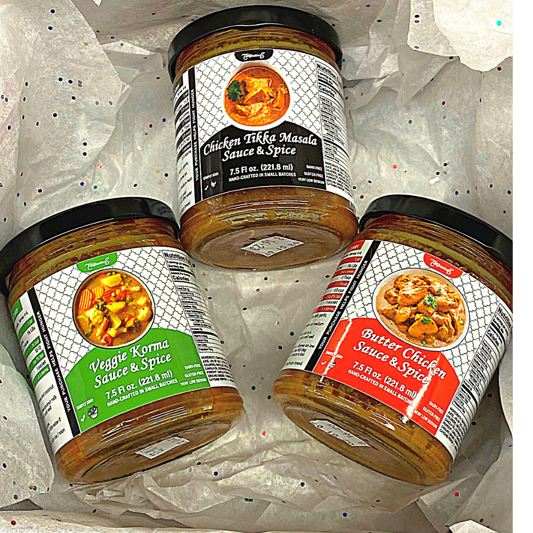 DESCRIPTION: THREE jars of Curry Sauce to make Butter Chicken Makhani, Chicken Tikka Masala and Veggie Korma. Each jar has traditional recipe and Garam Masala blend garnish.