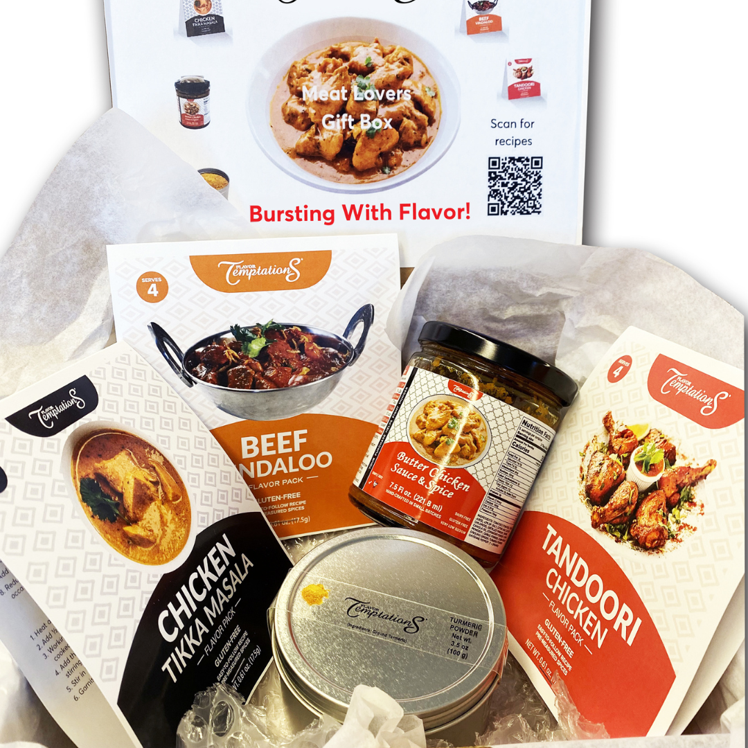 DESCRIPTION: Perfect gift for your family and friends who love Indian food! Present them with this gift box that contains gourmet spice and sauce ingredients to make multiple Indian meals from scratch. Great gift for a beginner or foodie interested in cultural cooking!