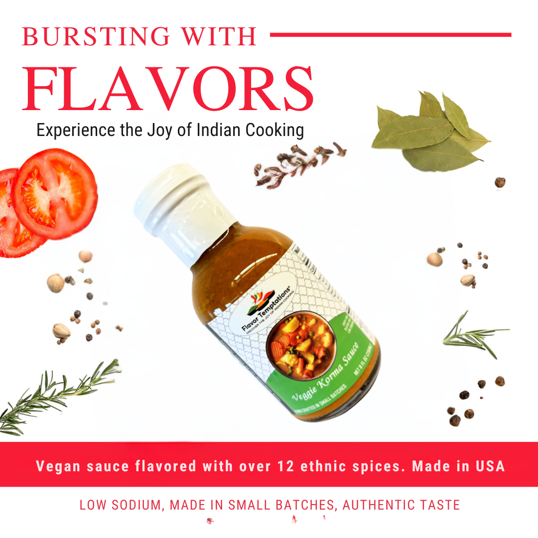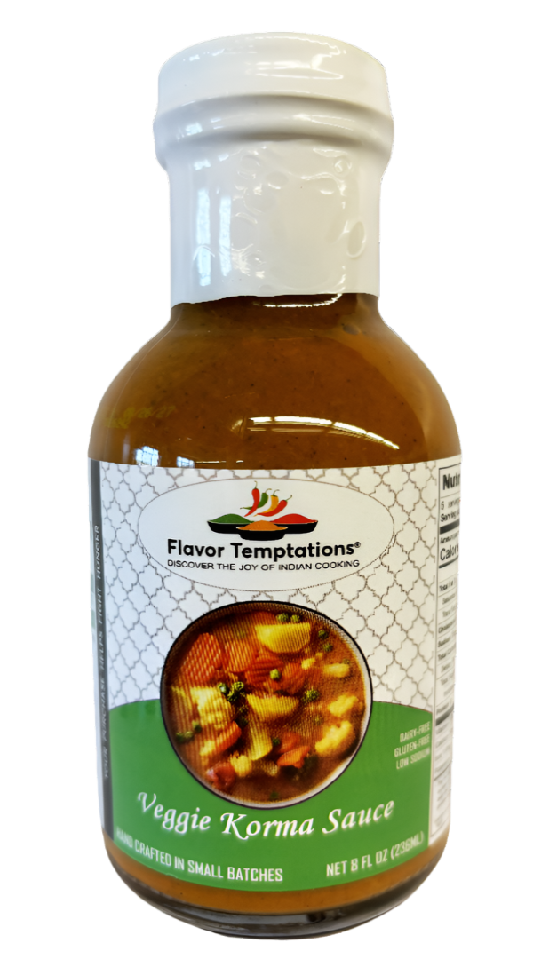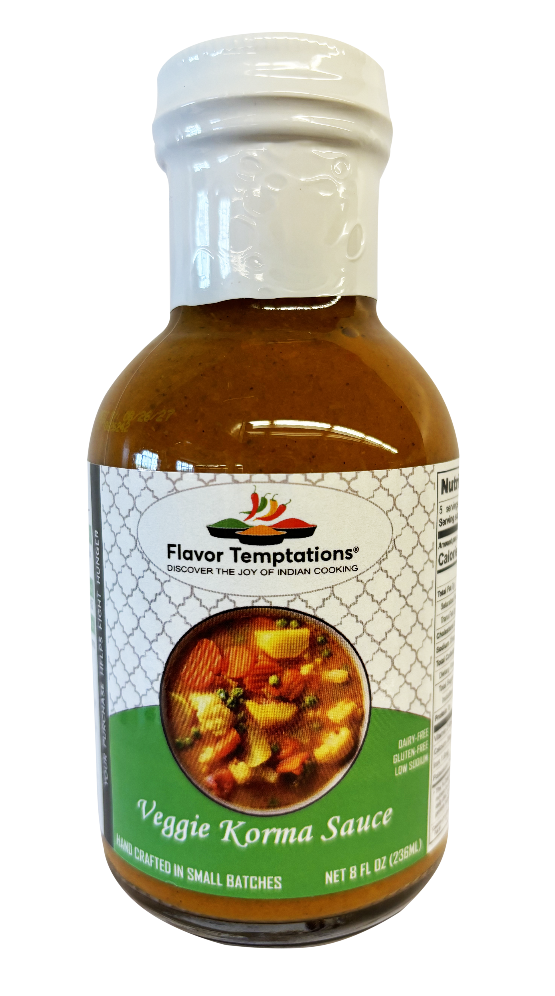 Make quick & easy VEGGIE KORMA MASALA with an authentic curry sauce made from organic spices. This Vegan, Gluten-Free, low sodium sauce is hand-crafted in the USA. Each 8 oz jar makes 5 servings.