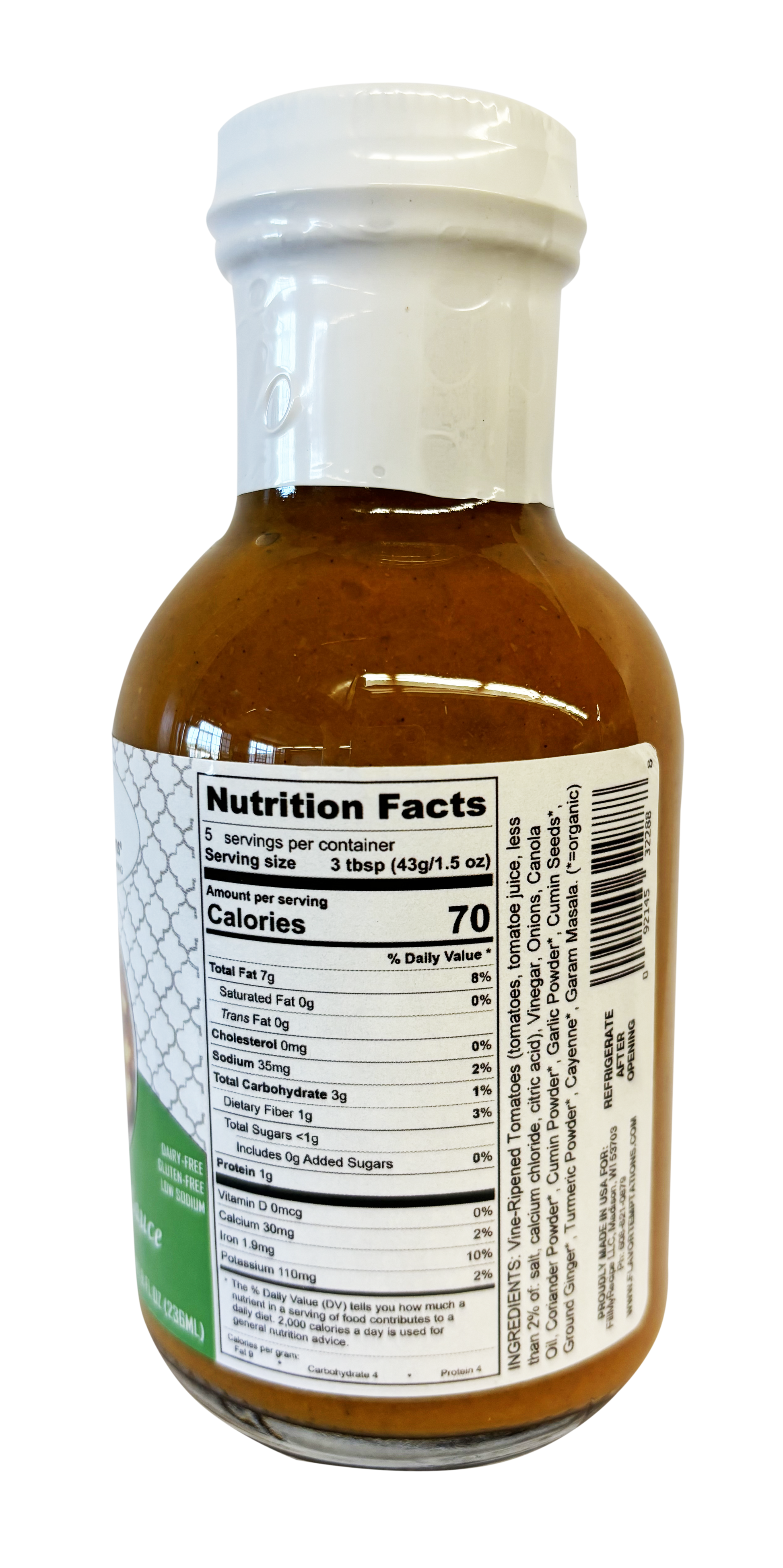 Tomatoes (Tomatoes, Tomato juice, <2% of: salt, citric acid, calcium chloride), Distilled vinegar, onions, canola oil, Organic Coriander powder, Organic Cumin powder, Garlic powder, Organic Cumin seeds, Ground ginger, Organic Turmeric powder, Organic Cayenne pepper, Organic Garam masala (Bay leaf, Cinnamon, Black pepper, Cloves, Cumin seeds, Coriander seeds, Cardamom)